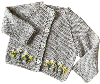 The Daisy Embroidered Cardigan, knit with Drops Baby Merino in Light Beige. Embroidery also done with Drops Baby Merino in Lemon Punch, Olive, and White.